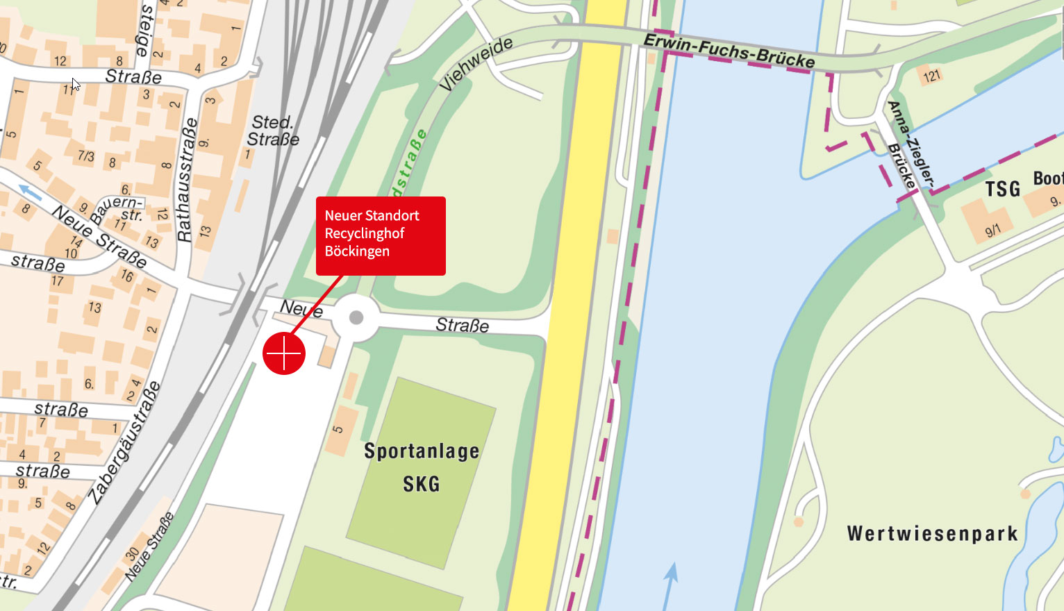Die vorübergehende Verlagerung des Recyclinghofs Böckingen zum gut erreichbaren neuen Standort auf der nördlichen Viehweide wurde erforderlich, um Platz für die Neugestaltung des Böckinger Bahnbogens mit durchgängigen, begrünten Geh- und Radverbindungen zu schaffen.