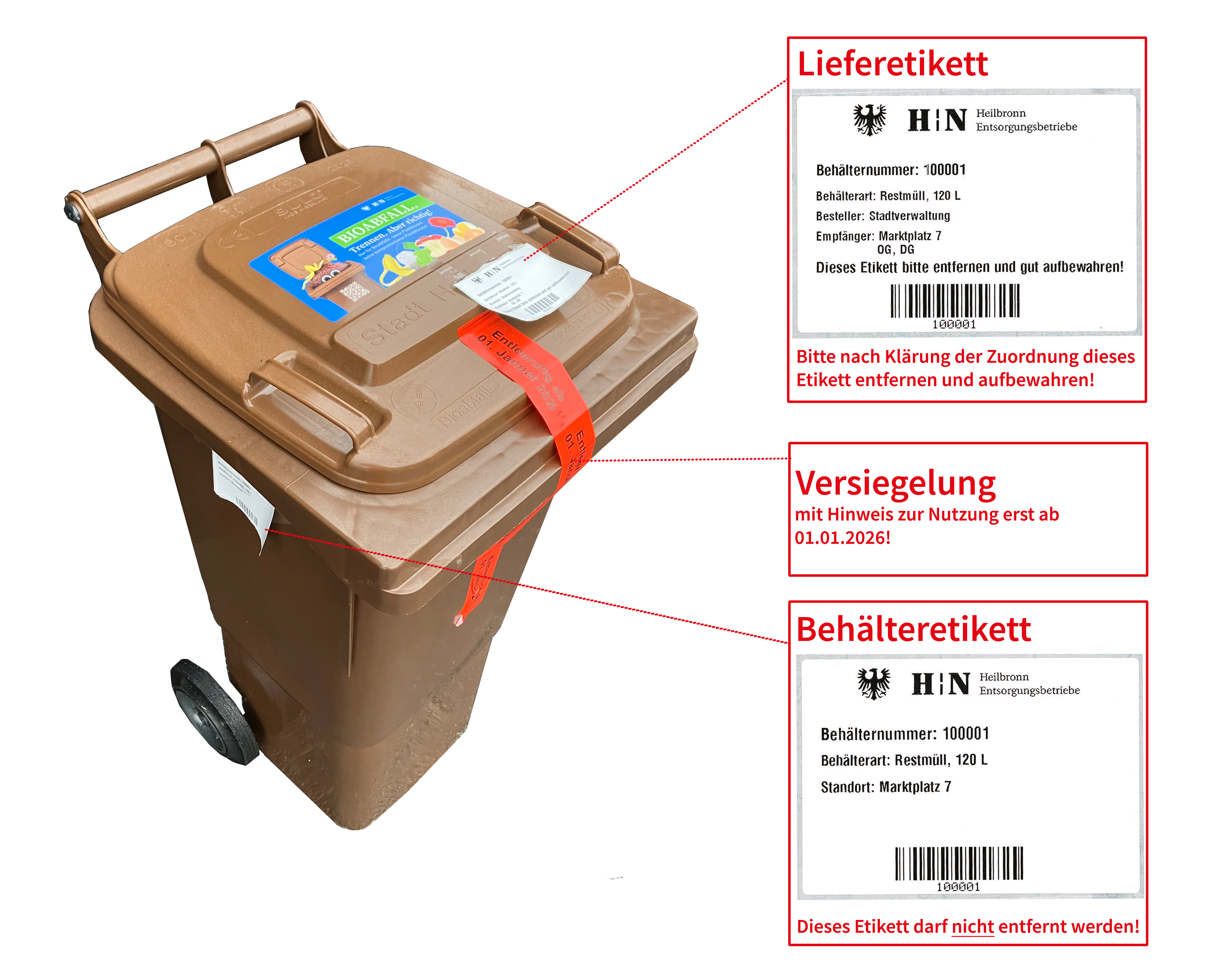 - Der Behälter ist Eigentum der Stadt Heilbronn. Eine dauerhafte Kennzeichnung des Behälters (z.B. mit Farbe) ist nicht zulässig! Sofern erforderlich, verwenden Sie bitte eine entfernbare Markierung (z.B. Aufkleber).